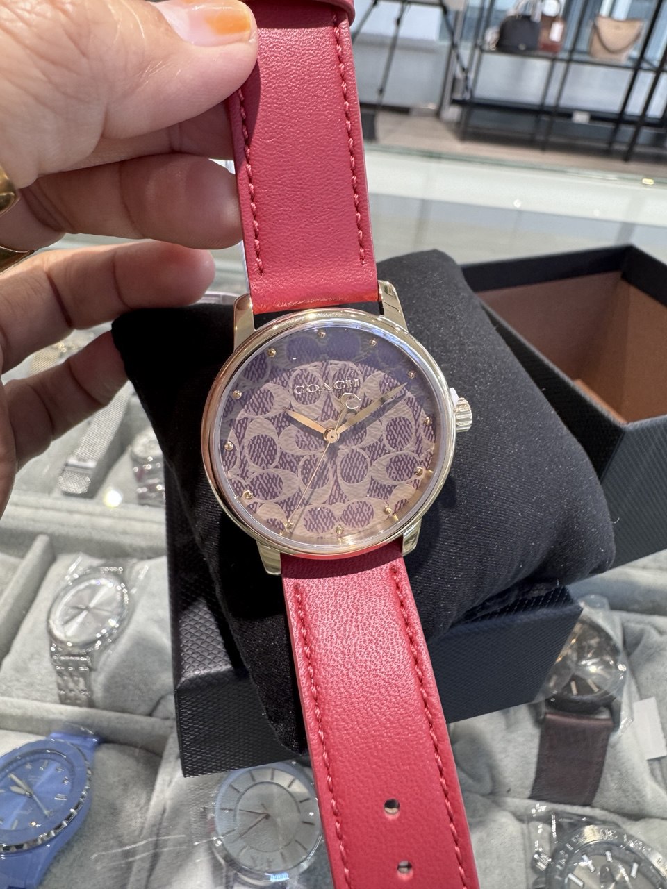 Gold-tone stainless steel case with a red leather strap. Fixed gold-tone stainless steel bezel. Brown dial with gold-tone hands and index hour markers. Dial Type: Analog. Quartz movement. Scratch resistant mineral crystal. Pull / push crown. Solid case back. Round case shape, case size: 36 mm. Buckle clasp. Water resistant at 30 meters / 100 feet. Functions: hour, minute, second. Grand Series. Casual watch style. Coach Grand Quartz Brown Dial Ladies Watch 14503874.