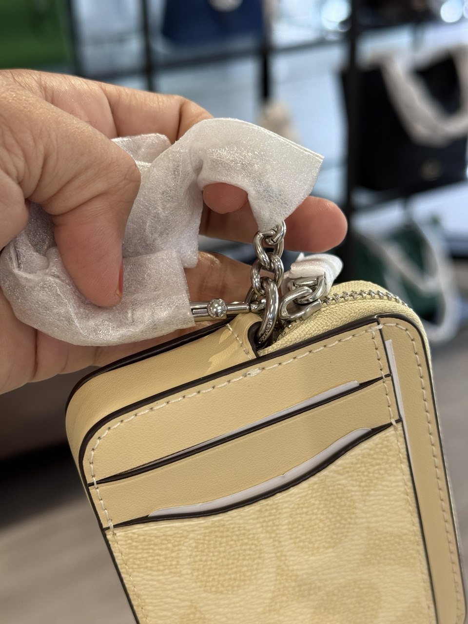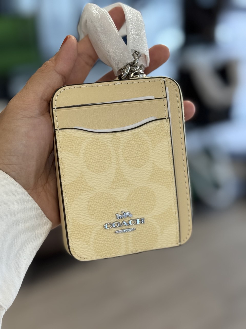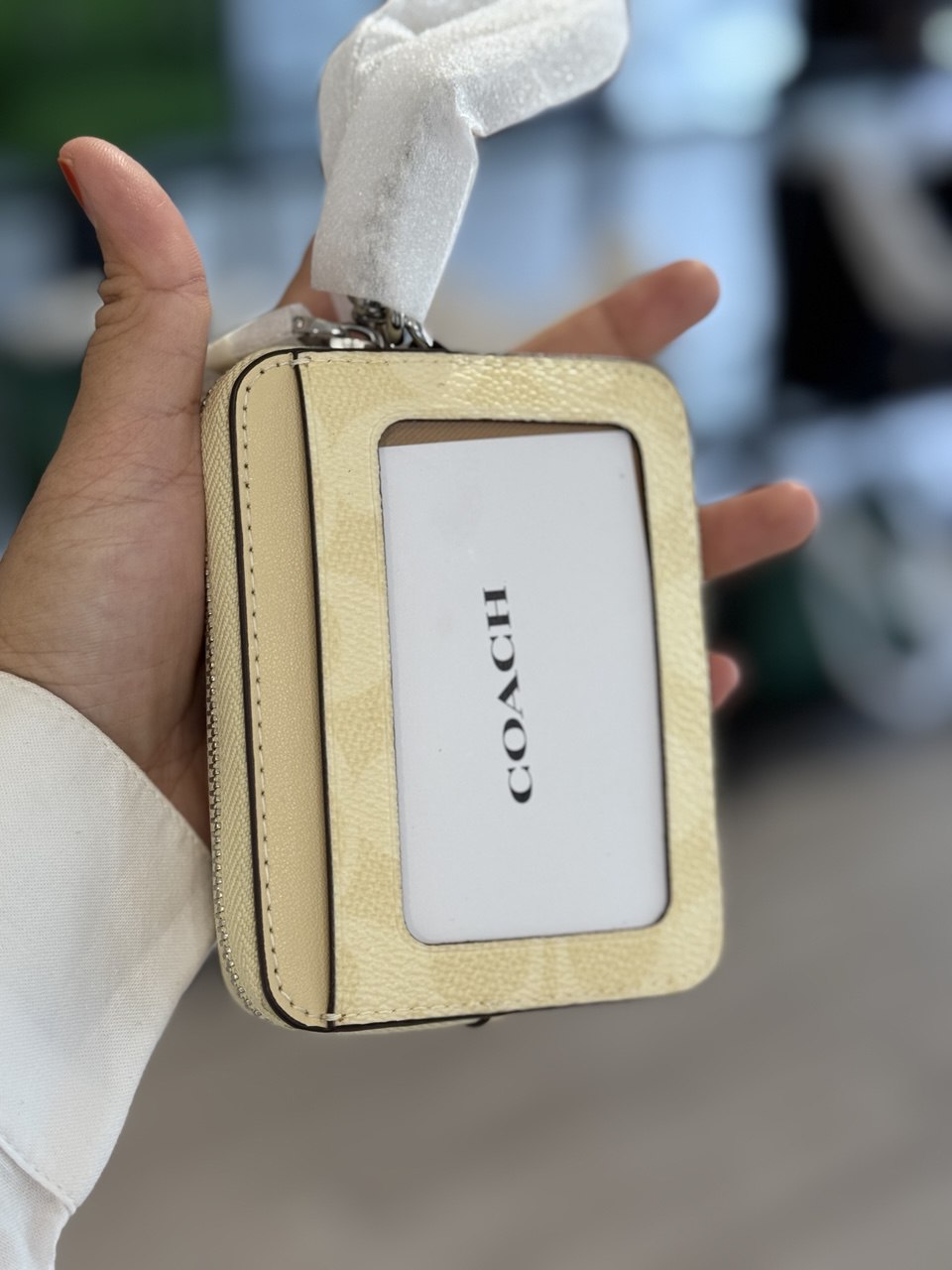 An ultra-compact essential, this Zip Card Case is crafted of durable Signature Coated Canvas. It’s the perfect size to slip into your pocket or bag, holding all your essential cards and cash with ease. The zip closure of this designer zip card case keeps everything secure, while the convenient slots organize your cards. Plus, it has a handy window to easily display your identification. To complete the look of this zip card case wallet, a chain wrist strap adds a touch of shine. It’s the ultimate, lightweight companion for keeping your necessities close at hand.