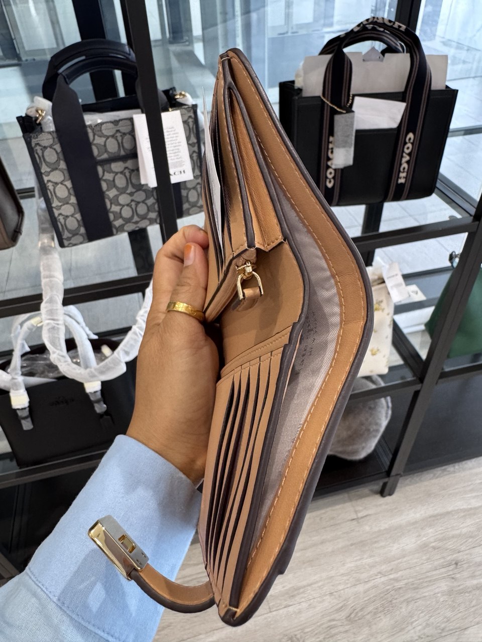 Interior: 10 credit card slots, 3 slip pockets, bill slot, zip pocket, 1 vented pocket